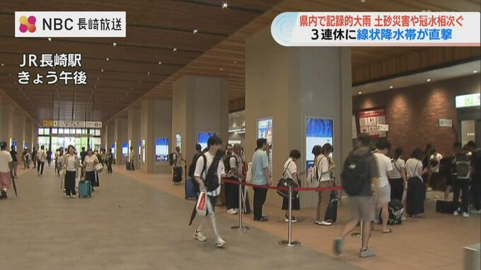 三連休最終日のJR長崎駅。武雄温泉と博多を結ぶリレーかもめが大雨の影響で午前中を中心に運行を見合わせたため、払い戻しや予約を取り直す多くの観光客の姿が見られました。