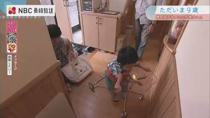初対面の日、歩行器で歩く大輝さんのあとを、愛大くんは床にお尻をつけて座った姿勢で足を動かし、一生懸命追いかけました。