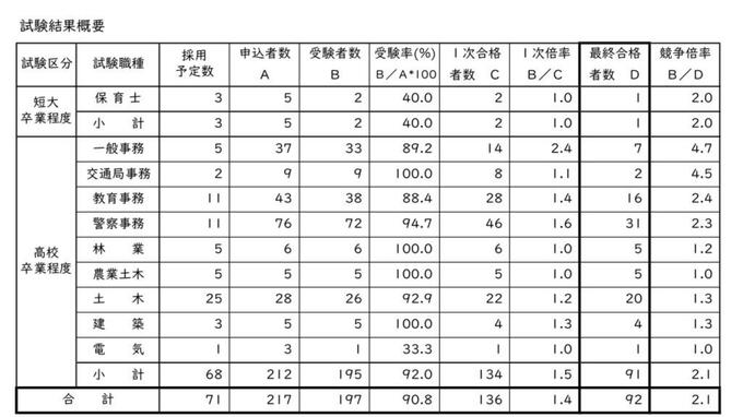 短大、高校卒業程度あわせて、全体の競争倍率は2.1倍となり過去3年間で最も低い水準となりました(令和5年度:4.3倍、令和6年度:3.5倍)。