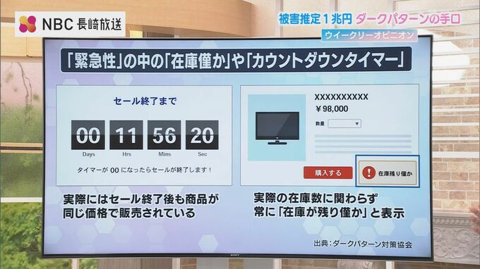 二つ目が「緊急性」の中の「在庫僅か」や「カウントダウンタイマー」。これは「在庫僅か」や「残り〇時間で終了」といった表示で、費者に緊急性や焦燥感を与え、冷静な判断を妨げる手法です。