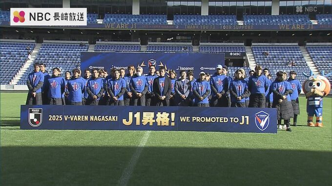 J1昇格を祝い、V・ファーレン長崎は6日、長崎市でパレードし、その後、ピーススタジアムで、昇格記念のセレモニーを行いました。
