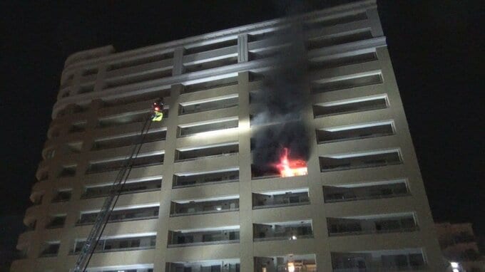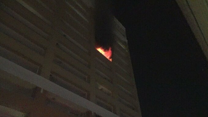 「午後11時24分です。佐世保市三浦町のマンションです。ベランダから勢いよく火が出ています。」