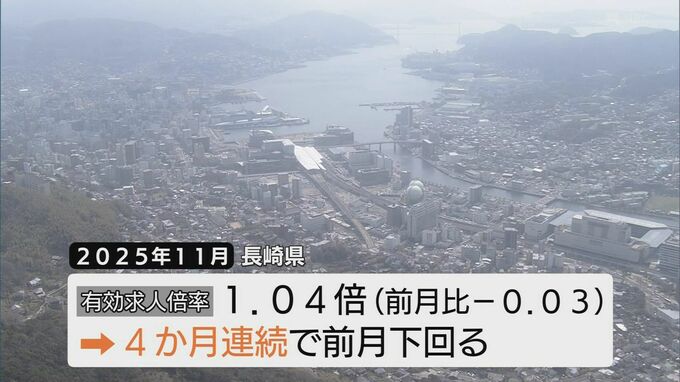 去年11月の長崎県内の有効求人倍率は1.04倍で、4か月連続で前の月を下回りました。