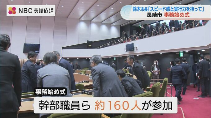 長崎市の事務始め式には、幹部職員らおよそ160人が出席し、鈴木市長が今年の市政運営に向けた年頭のあいさつを述べました。