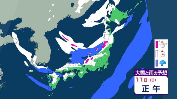 11日(日)朝までには、日本海に強力な雪雲の帯「JPCZ」が発生し、東北地方の日本海側に流れ込む見込みです 。