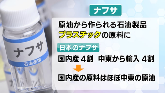 【平】ナフサは原油から作られ、プラスチック製品の原料になります。国内産と中東からの輸入約4割ずつですが、国内産の原料も殆どが中東の原油です。