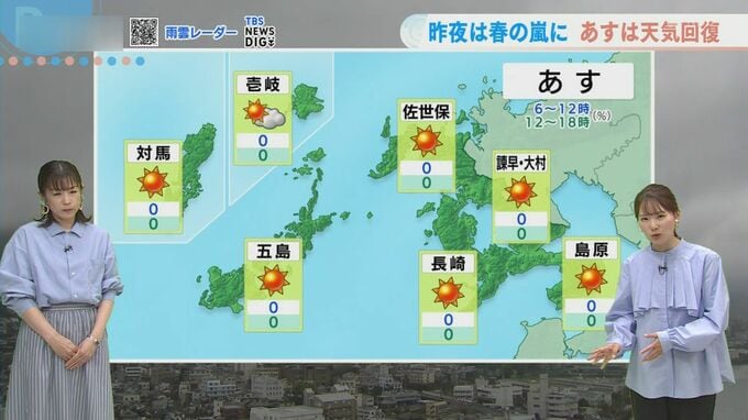 最高気温は長崎で19℃から23℃と、4月下旬から5月上旬並みのぽかぽか陽気となりそうです。ただし、最低気温は12℃から13℃とけさよりも5度前後低くなる見込みで、朝晩は上着が必要です。