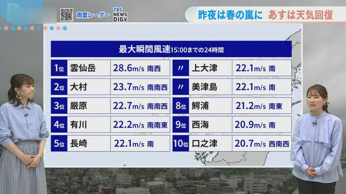 10日(木)は低気圧が日本海を進んだ影響で、県内各地に強風が吹き荒れました。最大瞬間風速は雲仙岳で28.6メートル)に達し、大村(23.7メートル)、厳原(22.7メートル)など県内の多くの地点で瞬間的に20メートルを超えました。