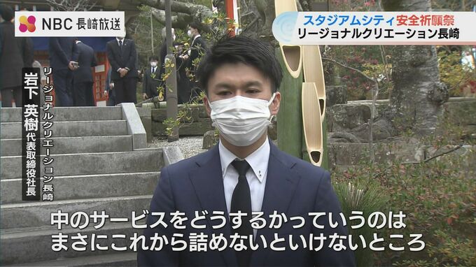 安全祈願祭にはスタジアムシティプロジェクトを手がけるリージョナルクリエーション長崎の岩下 英樹 社長やスタッフ、それに工事関係者らが参列しました。