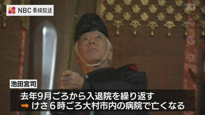 諏訪神社によりますと、池田宮司は2022年9月ごろから体調不良を理由に入退院を繰り返していましたが、12日午前6時ごろ、大村市内の病院で亡くなったということです。