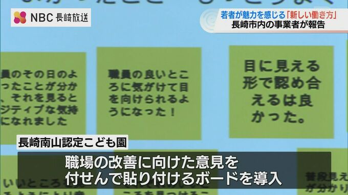 このうち、長崎南山認定こども園は、職場の改善に向けた意見を『付せん』で貼り付けるボードを新たに取り入れたことで 職員が安心して意見を出せるようになったことなどを報告しました。