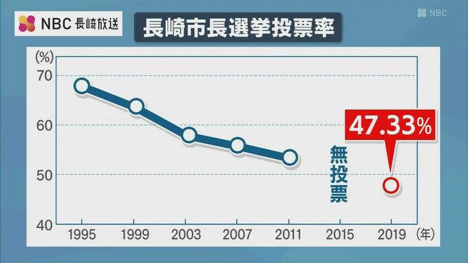 16年ぶりにトップが変わる長崎市ですが、投票率は減少傾向が続いていて、前回は47.33%と初めて50%を割り込み過去最低を更新しました。