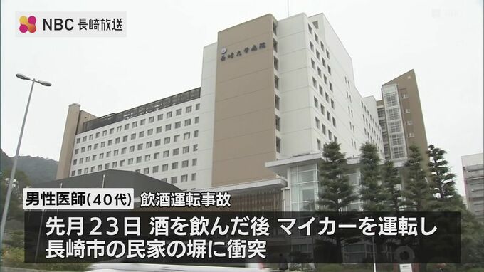 長大病院によりますと、事故を起こしたのは、40代の男性医師で、6月23日、酒を飲んだ後、マイカーを運転し、長崎市の民家の塀に衝突する事故を起こしたということです。