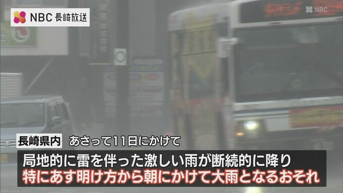 気象台によりますと、対馬海峡付近にある梅雨前線は11日にかけて停滞し、県内は11日にかけて局地的に雷を伴った激しい雨が断続的に降る見込みです。特に10日明け方から朝の時間帯には非常に激しい雨が降り大雨となるおそれがあります。
