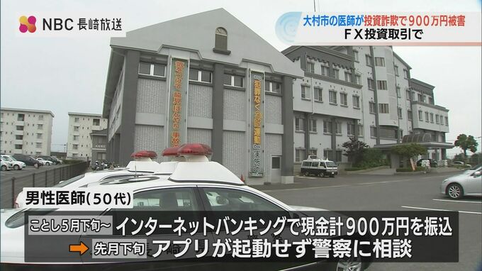 スマートフォンアプリを使った嘘のFX投資取引を持ち掛けられた長崎県大村市の医師が現金900万円を騙し取られ、警察はニセ電話詐欺事件として捜査しています。