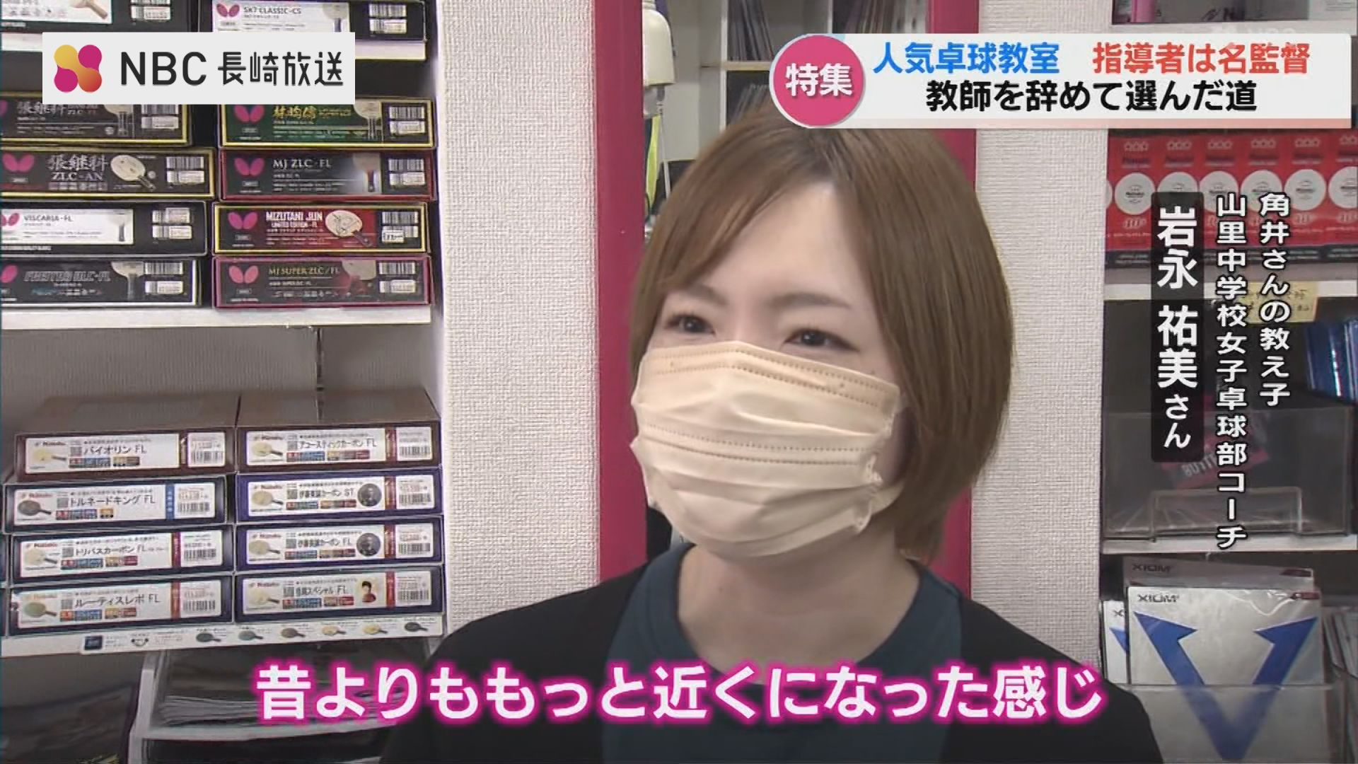 長崎女子商業高校の教え子である山里中学校 女子卓球部 コーチ 岩永 祐美さん「母校で先生に会えないっていうのは寂しさもあったんですけど、今日こんな感じだったとか報告しに行ってたりとか、昔よりもっと近くになった感じですね。こうやって用具の相談もできますし」