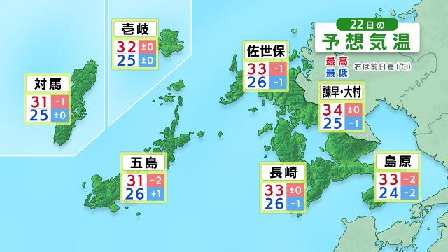 気象庁と環境省は、22日(火)は熱中症の危険性が極めて高いとして、長崎県に熱中症警戒アラートを出し、外出をなるべく避け、室内をエアコンなどで涼しい環境にして過ごすよう呼びかけています。