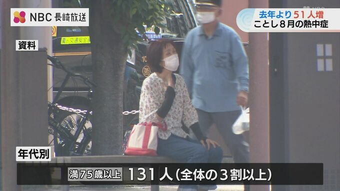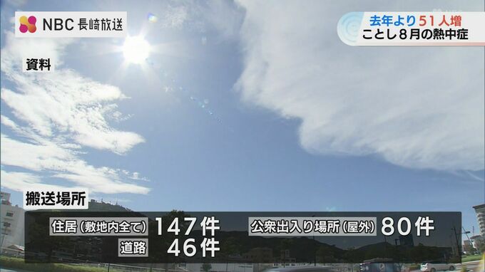 長崎県消防保安室のまとめによりますと、県内で先月一か月間に熱中症で救急搬送された人の数は、去年の同じ月より51人多い359人でした。
