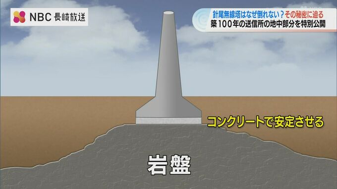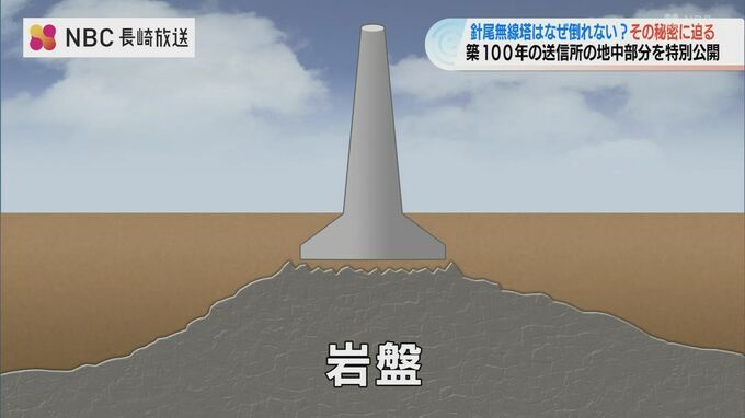 無線塔の基礎の下には岩盤があり、大まかにいうと無線塔は、その岩盤の上に乗る形で建っています。
