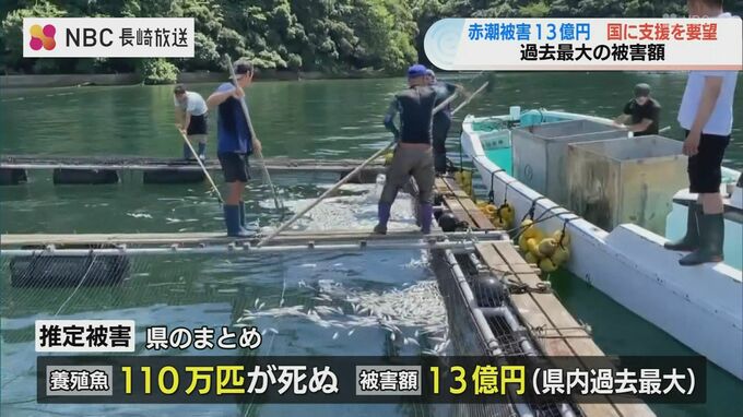 長崎県によりますと、養殖のトラフグやシマアジなど約110万匹が死に、被害額は、長崎県内の赤潮被害としては過去最大となる約13億円と推定されています。