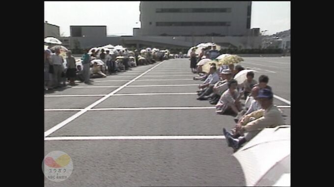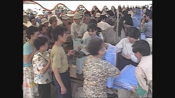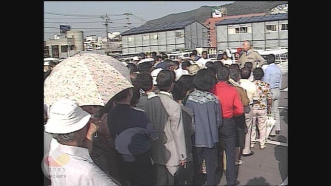 瓦を飛ばされた市民のために、長崎市がブルーシートを配布しましたが、そこに予想を大きく超える被災者が殺到し、配布を待つ長い列が出来ました。