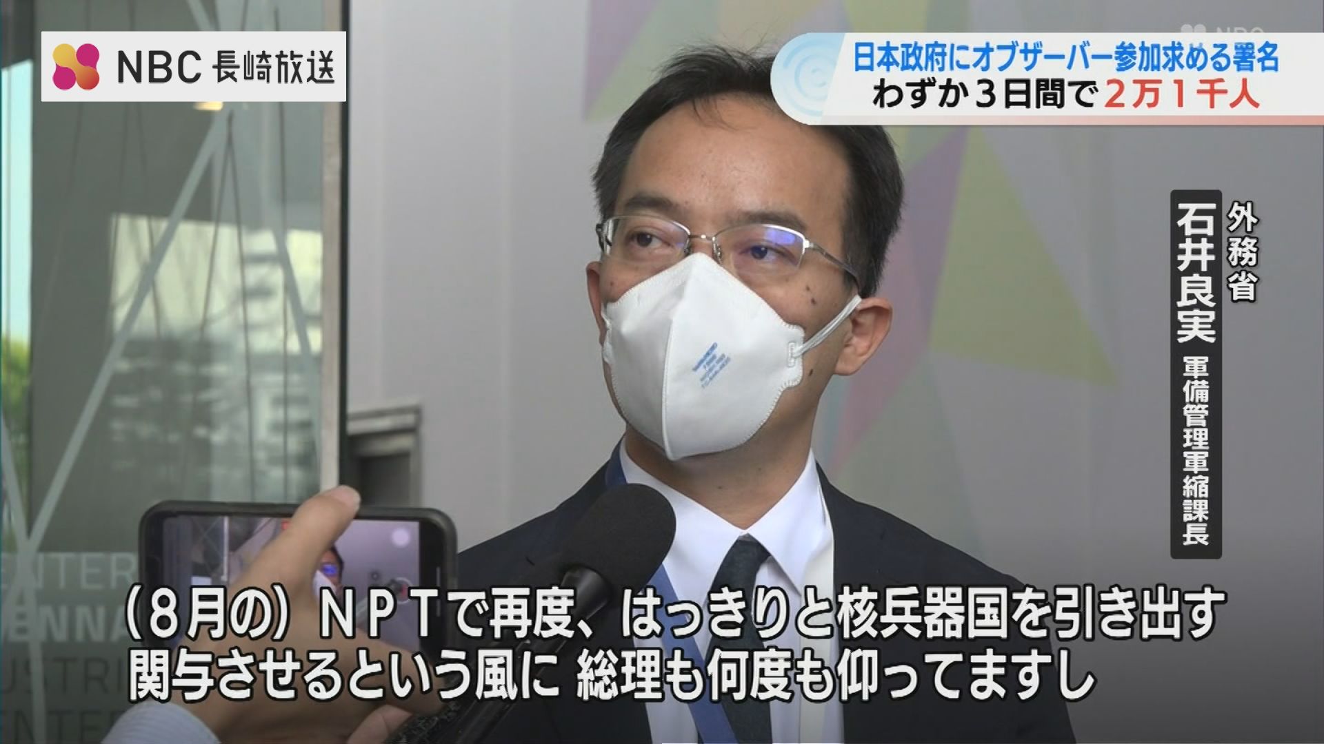 「(8月に開催される)NPT(核兵器不拡散条約)で再度、ここで、はっきり核兵器国を引き出す、関与させる、と総理も何度も仰ってますし、そういった方針のもとで、我々もがんばる」