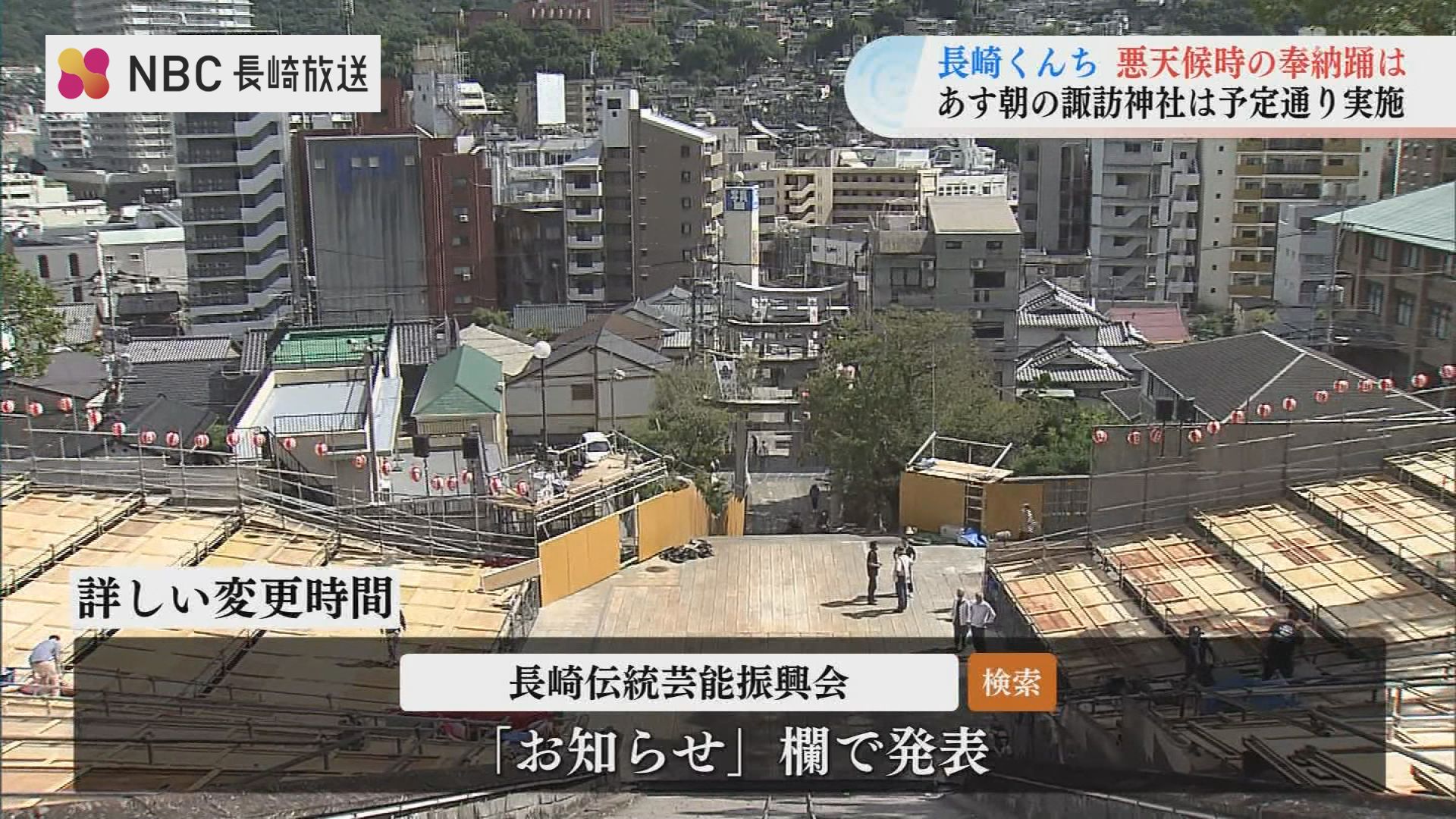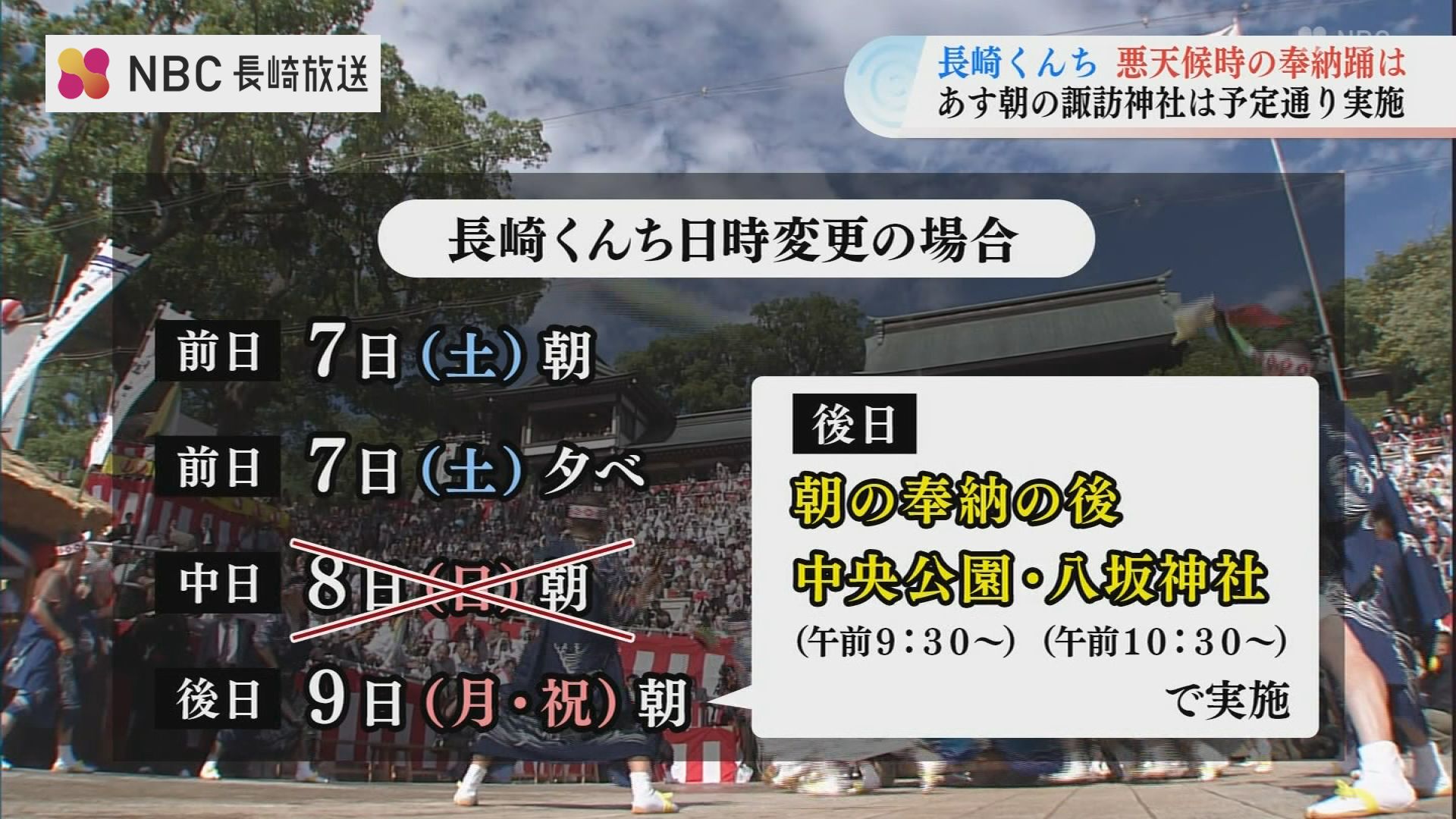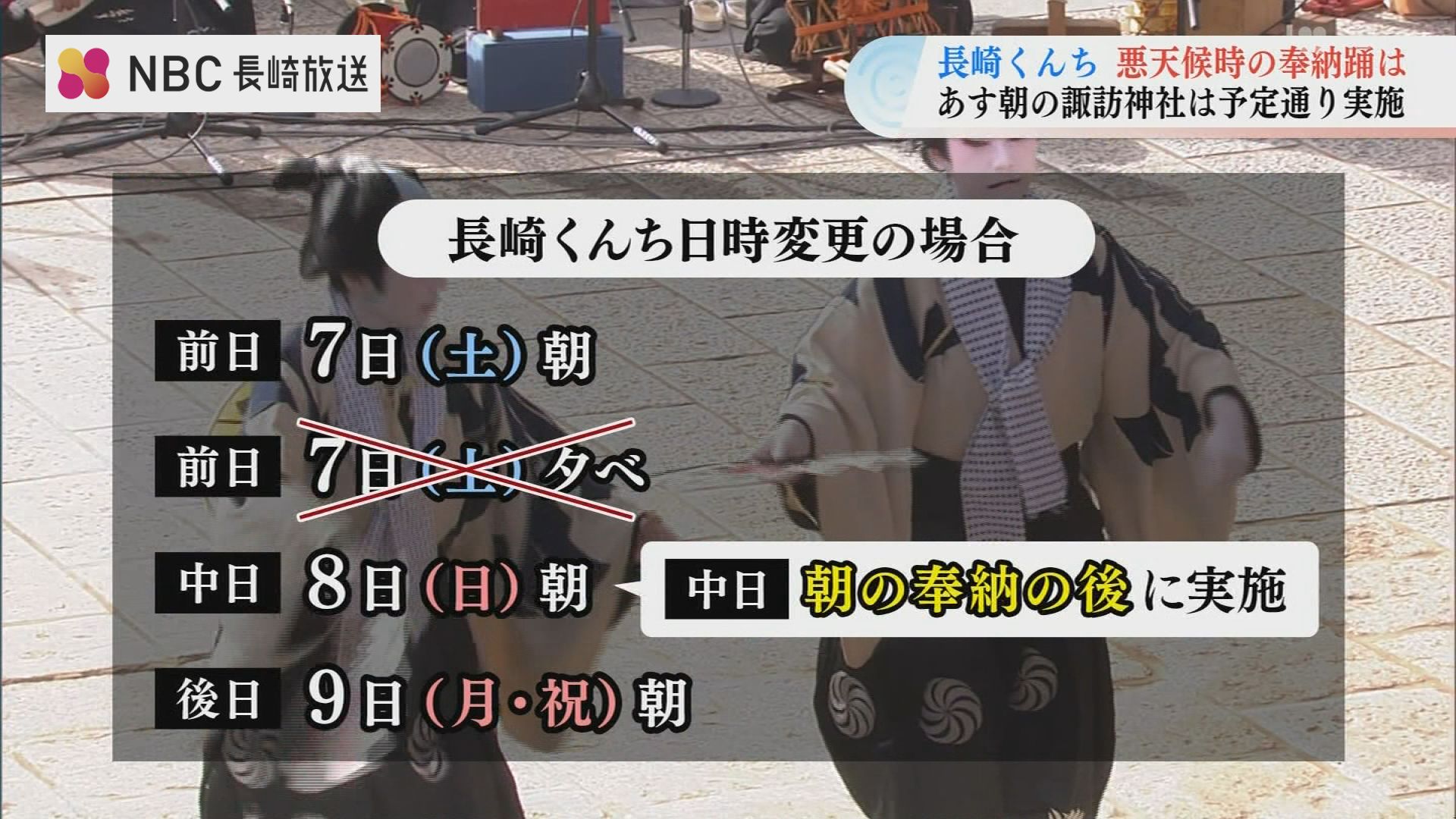 あす朝の諏訪神社での奉納踊は予定通り行われますが、長崎伝統芸能振興会によりますと、悪天候により7日、前日の夕べの奉納踊ができない場合は8日、中日の朝に行われる奉納の後に変更されます。