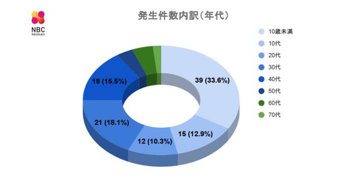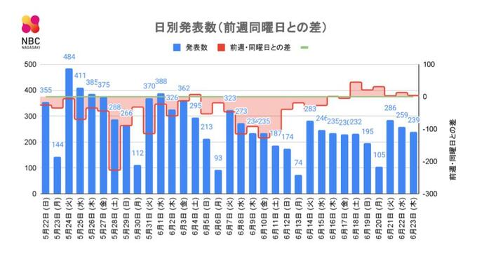 【長崎】239人が新型コロナ陽性 前週 同曜日比 +4人(6日連続 増加) 2022年6月23日(木) 15:25 国内 長崎県内で239人が新型コロナ陽性(23日発表) ▽前週・同曜日比 +4人(6日連続 増加) 【市町別】(人) 長崎市 63 佐世保市 60 島原市 5 諫早市 50 大村市 21 平戸市 1 松浦市 1 対馬市 1 壱岐市 0 五島市 12 西海市 2 雲仙市 3 南島原市 3 長与町 4 時津町 4 東彼杵町 1 川棚町 0 波佐見町 0 小値賀町 0 佐々町 3 新上五島町 5 【年代別】(人) 10歳未満 39 10代 15 20代 12 30代 21 40代 18 50代 4 60代 5 70代 2 80代 0 90歳以上 0 確認中 0