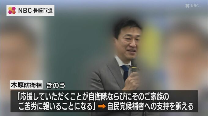 応援演説の中で木原大臣は、防衛費増額に伴う自衛官の待遇改善などに触れ、自民党の候補を「応援して頂くことが自衛隊ならびにそのご家族のご苦労に報いることになる」と発言し、候補者への支持を訴えました。