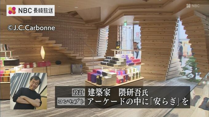 設計を手掛けたのは建築家の隈研吾氏で、国産の杉を使いアーケードの中に「安らぎ」を与えられる建物をコンセプトに作られました。
