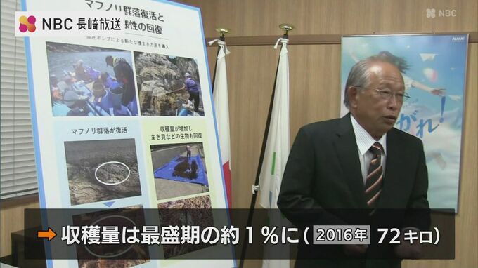 久賀島は、長崎県内有数の「マフノリ」の産地で、約60年前には6トン程が収穫されていました。しかし水温上昇に伴う食害が進み、藻場に石灰質の生物が沈着する「磯焼け」が進行ー、収穫量は最盛期の1%にまで激減しました。