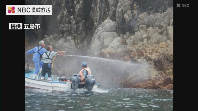 以前は船から岩場に降り、スコップなどを使って生物をはがし手作業で胞子を散布していましたが、高圧ポンプを使えば船上から作業できるため安全性も高く、効率も上がるため今後のさらなる収穫量回復も期待されています。