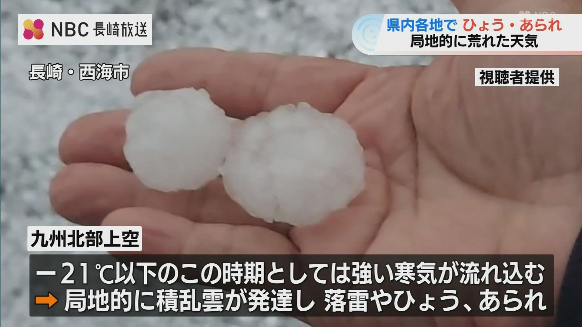 27日朝の長崎県内は、強い寒気の影響で局地的に「ひょう」や「あられ」が降るなど荒れた天気となりました。