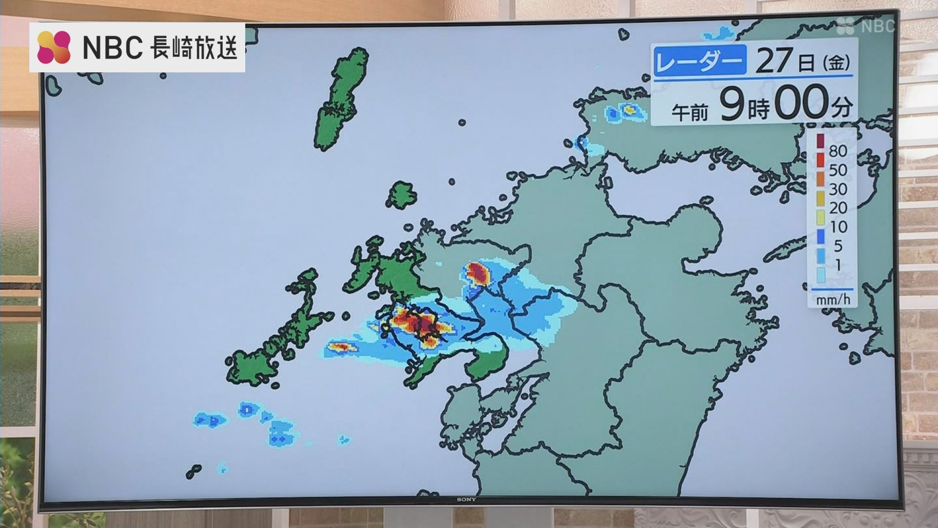 その時間帯の雨雲レーダーを見ると、27日午前9時には大村湾を中心に強い雨雲が観測されています。