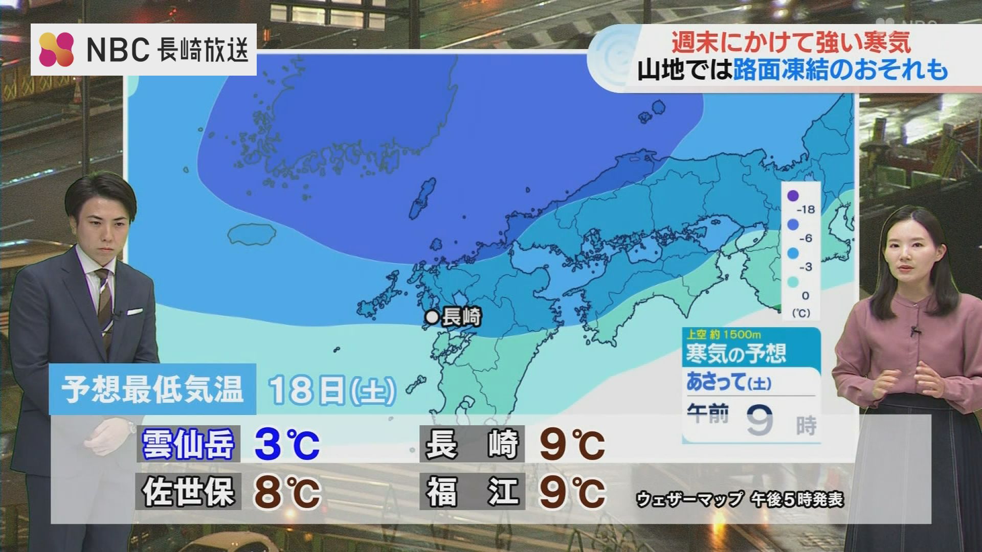 18日(土)の予想最低気温は、雲仙岳で3度、佐世保市で8度、長崎と福江で9度と予想されています。