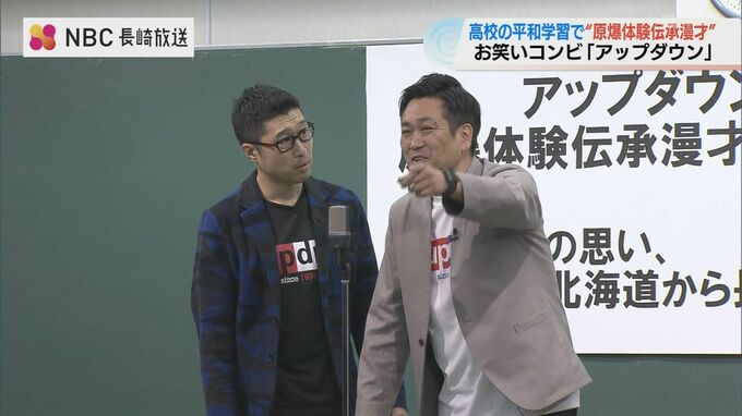 笑いを通して伝える平和の大切さ「原爆体験伝承漫才」お笑いコンビ アップダウン 高校生が鑑賞 2023年11月17日(金) 17:53 国内 原爆の体験を漫才で伝える活動を続けているお笑いコンビ『アップダウン』が17日、高校の平和学習の一環で生徒たちに漫才を披露しました。「防空壕に逃げ込む。身を屈めていたらドッカーン!」「大爆笑」「違うわ。…