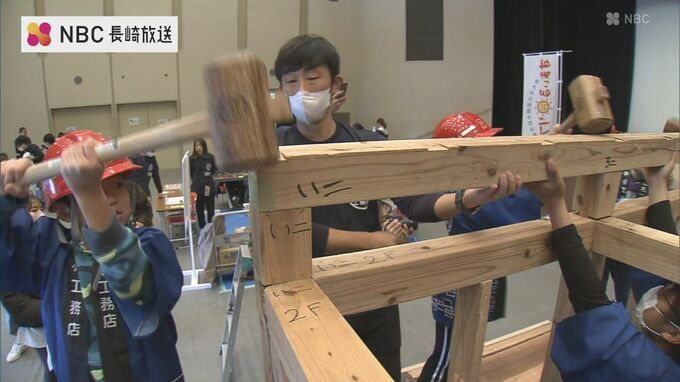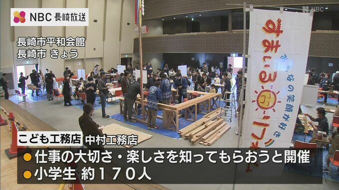 このイベントは子どもたちに仕事の大切さや建築業の楽しさを知ってもらおうと長崎市の中村工務店が開いたもので、小学生およそ170人が参加しました。