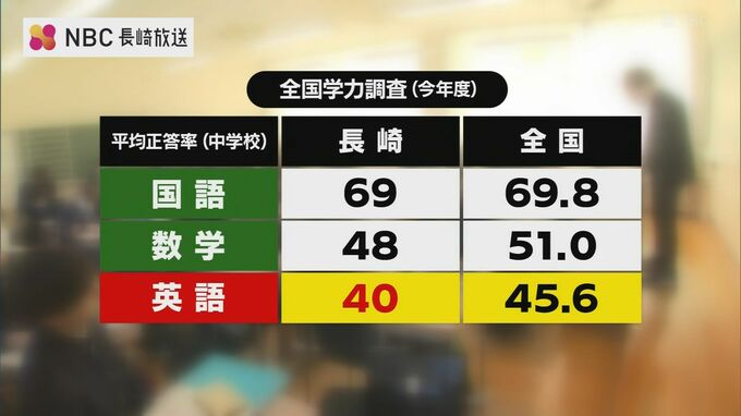 今年度の中学生の全国学力調査によりますと、長崎県は『英語』の正答率が、他の『国語』『数学』と比べて全国平均を大きく下回っていて、英語力に課題を抱えています。