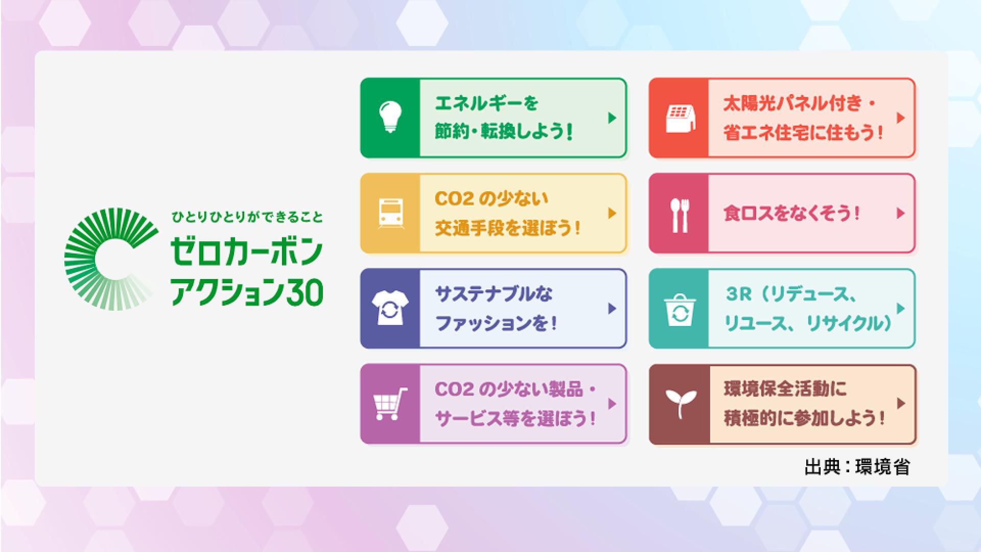 これに対しては「ゼロカーボンアクション30」という項目があり、8つの分野で30の項目が掲げられています。