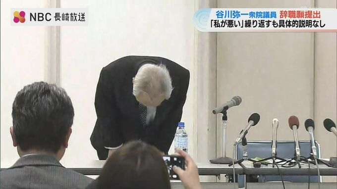 およそ6週間ぶりに報道陣の前に姿を見せた長崎3区選出の谷川弥一衆院議員は22日午後、衆議院に辞職願を提出し大村市内で会見を開きました。