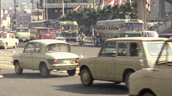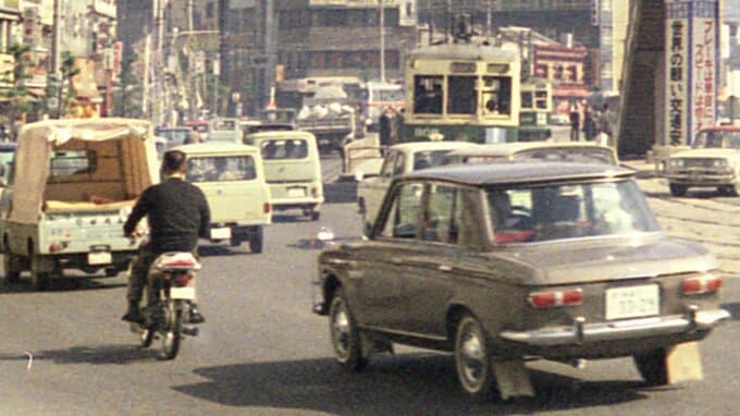 車のデザインが時代を感じさせます。緑のカラーリングの県営バスも走っています。当時は原付バイクはヘルメットを被らず運転することができました。道路の様子を見ることで時代の変化を感じられます。