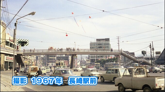 街並みが随分、今と違います。高架広場もなく、右端には三角屋根時代の 国鉄 長崎駅の駅舎の一部が映っています。