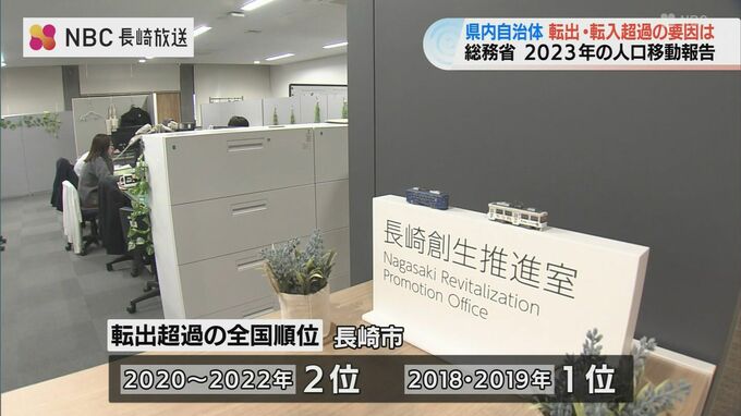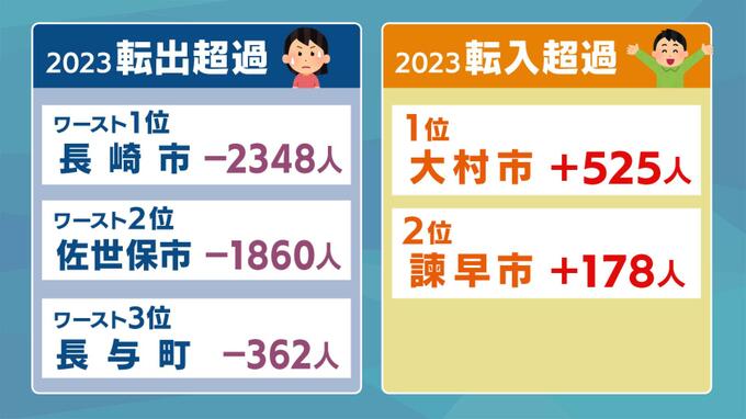 先月、総務省が公表した去年1年間の人口移動報告によりますと、長崎県内の自治体では転出する人が転入する人を上回る “転出超過” のワースト1位は「長崎市」で、次いで佐世保市、長与町となっています。一方、転入超過は大村市と諫早市のみとなっています。
