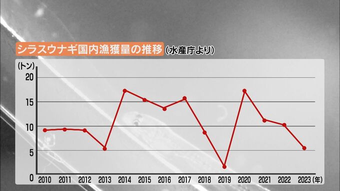 うなぎの稚魚であるシラスウナギ。1957年の統計開始以来、国内の漁獲量は大きく減少。昨シーズンは5.6トンで、前年の10.3トンより半減し、過去3番目の少なさでした。その希少性から過去には1キロあたり299万円という高値で取り引きされたこともあり、「白いダイヤ」とも呼ばれています。