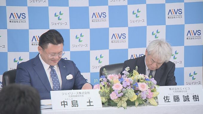 大分市のジェイリース本社で12日会見が開かれ、中島土社長とエイビスの佐藤誠樹社長が株式の譲渡契約を交わしました。
