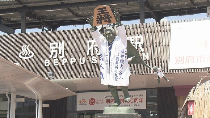白い法被をまとったJR別府駅の油屋熊八像。王将という将棋の駒を掲げて、名人戦をアピールする姿に行き交う人たちもカメラを向けます。