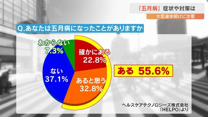 20代から50代までの働く男女1200人を対象にした民間のアンケートによりますと、五月病になったと感じたことがある人の割合は55.6%と半数以上でした。子どもから大人まで、どの年代にも起こりえるという「五月病」。専門医はうつ病に発展する可能性も指摘します。