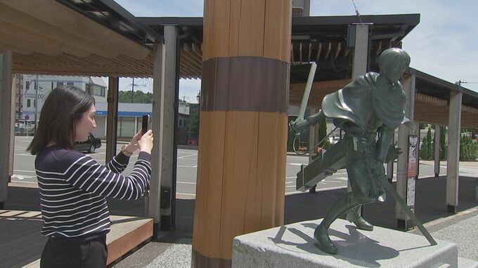 週末のJR日田駅前。「進撃の巨人」に登場する人気キャラクターの銅像を写真に収めようと全国からやってきたたくさんのファンの姿がありました。