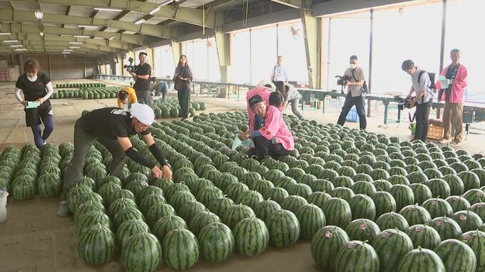 24日は主力品種となっている「羅皇ザ・スウィート」1200玉が出荷され、関係者が出来栄えを確認していきました。今年は春先の天候不順でやや小ぶりとなっていますが、甘さや食感は、例年通りの出来栄えだということです。