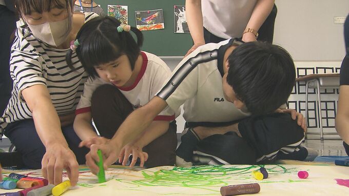 大分市の県立盲学校で行われた共同制作には、全盲や弱視といった視力障害がある幼小学部と高等部の子どもたち11人が参加。北村さんが白のアクリル絵の具で下書きをしたキャンバス地への色塗りに挑戦しました。